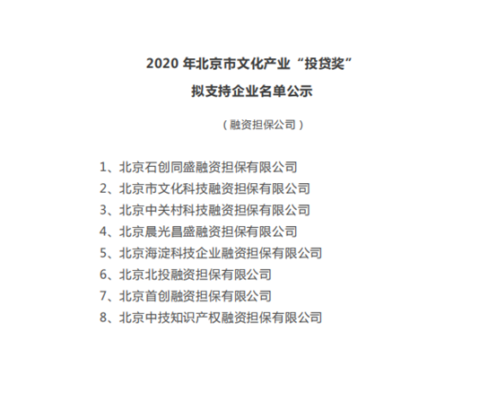 根據(jù)《北京市實(shí)施文化創(chuàng)意產(chǎn)業(yè)“投貸獎(jiǎng)”聯(lián)動(dòng)推動(dòng)文化金融融合發(fā)展管理辦法(試行)》(京文領(lǐng)辦文〔2017〕3號(hào))、《文化創(chuàng)意產(chǎn)業(yè)“投貸獎(jiǎng)”聯(lián)動(dòng)政策金融機(jī)構(gòu)考核獎(jiǎng)勵(lì)實(shí)施細(xì)則》(京財(cái)科文〔2019〕2343號(hào))及《關(guān)于集中審核北京市文化產(chǎn)業(yè)“投貸獎(jiǎng)”支持資金申報(bào)項(xiàng)目的通知》,12月10日,北京市國(guó)有文化資產(chǎn)管理中心對(duì)2020年“投貸獎(jiǎng)”資金擬支持名單進(jìn)行了公示。此次進(jìn)入名單公示的文化企業(yè)、金融機(jī)構(gòu)共899家,其中8家融資擔(dān)保機(jī)構(gòu),北京中技知識(shí)產(chǎn)權(quán)融資擔(dān)保有限公司名列其中。