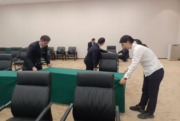 接到此次會議服務保障任務,物業(yè)公司領導高度重視,參加園區(qū)會前工作溝通會,全面協(xié)助落實會場布置。項目部根據(jù)會議保障服務相關要求,多次召開碰頭會,落實工作責任,細化任務分工。同時,物業(yè)公司總部調(diào)撥了人員和物資對會議進行支持。