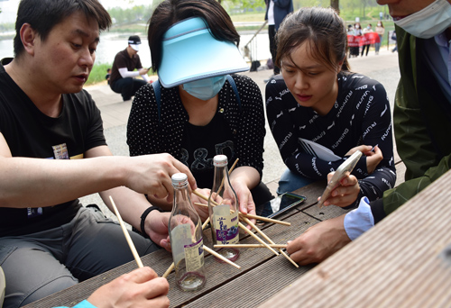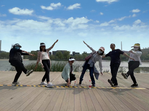 學(xué)員通過手機小程序隨機分成了10支隊伍,現(xiàn)場選出了各自團隊的隊長,設(shè)計了團隊的隊名和口號。本次活動共需要在首鋼園6個標(biāo)志性建筑闖關(guān)打卡,完成相應(yīng)任務(wù),獲取積分,這些標(biāo)志性建筑分別是超體空間、三高爐、秀池、茶鋼兒、群明湖和滑雪大跳臺。其中,任務(wù)類型包括益智類答題、企業(yè)文化類答題、手工制作、團隊造型擺拍等各項任務(wù)。每位參訓(xùn)學(xué)員頂著炎炎烈日,密切協(xié)作,分工明確,為達到團隊目標(biāo)共同努力奮斗。